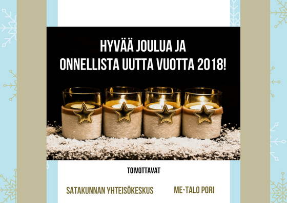 Hyvää joulua ja onnellista uutta vuotta 2018! Julkaistu 21.12.2017 Satakunnan yhteisökeskuksen toimisto on suljettuna 22.12.2017–1.1.2018. Tiistaina 2.1.2018 avoinna jälleen normaalisti klo 9–15.
