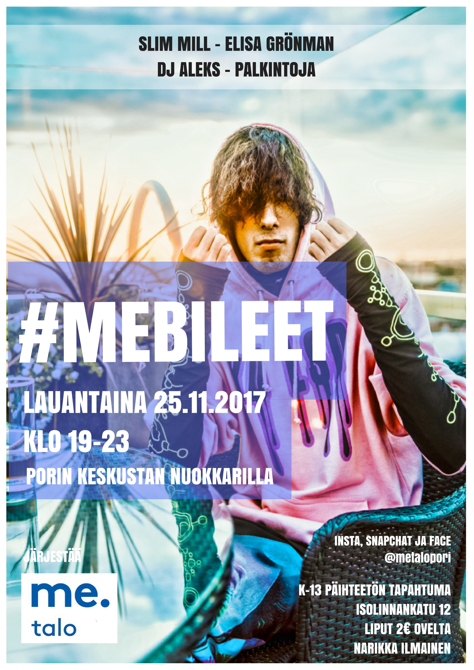 #MEBILEET lauantaina 25.11.2017 klo 19–23 TIEDOTE: Me-talo Porin avajaiset nuorille la 25.11.2017 #MEBILEET 25.11.2017 MAINOS