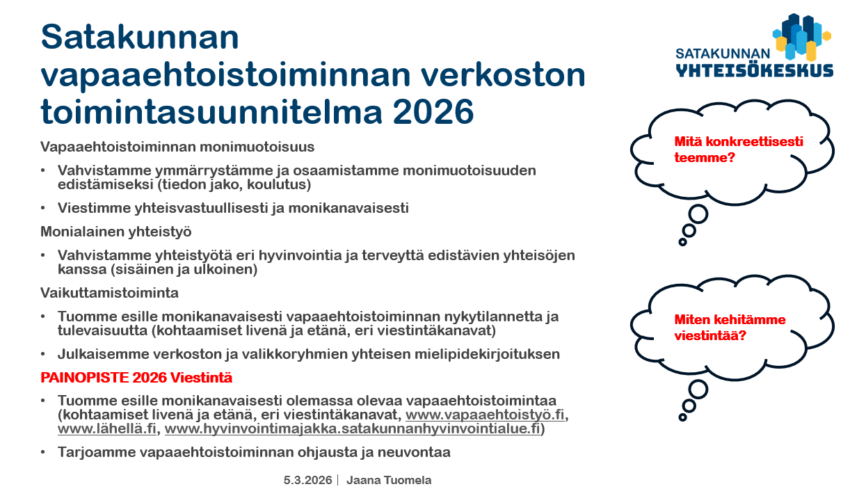 Satakunnan vapaaehtoistoiminnan verkoston tavoitteena on maakunnan vapaaehtoistoiminnan elinvoimaisuuden ylläpitäminen ja kehittäminen. Lisäksi verkosto jakaa tietoa ja kokemuksia, kehittää yhdessä vapaaehtois- ja vertaistukitoiminnan rakenteita sekä yhteistyötä. Verkosto kokoaa vuosittain toimintaa ohjaavan toimintasuunnitelman. Vuonna 2026 kokoonnumme neljä kertaa vuoden aikana etänä, jotta kaikkialta maakunnasta on helppo osallistua.