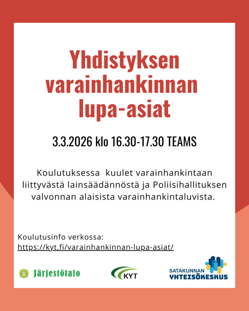 Varainhankinnan lainsäädännöstä ja varainhankintaluvista tietoa yleishyödyllisten yhdistysten toimijoille. Koulutuksen järjestävät Keski-Suomen Yhteisöjen Tuki ry, Yhteisöjen Yhdistys ry / Seinäjoen Järjestötalo ja Satakunnan yhteisökeskus